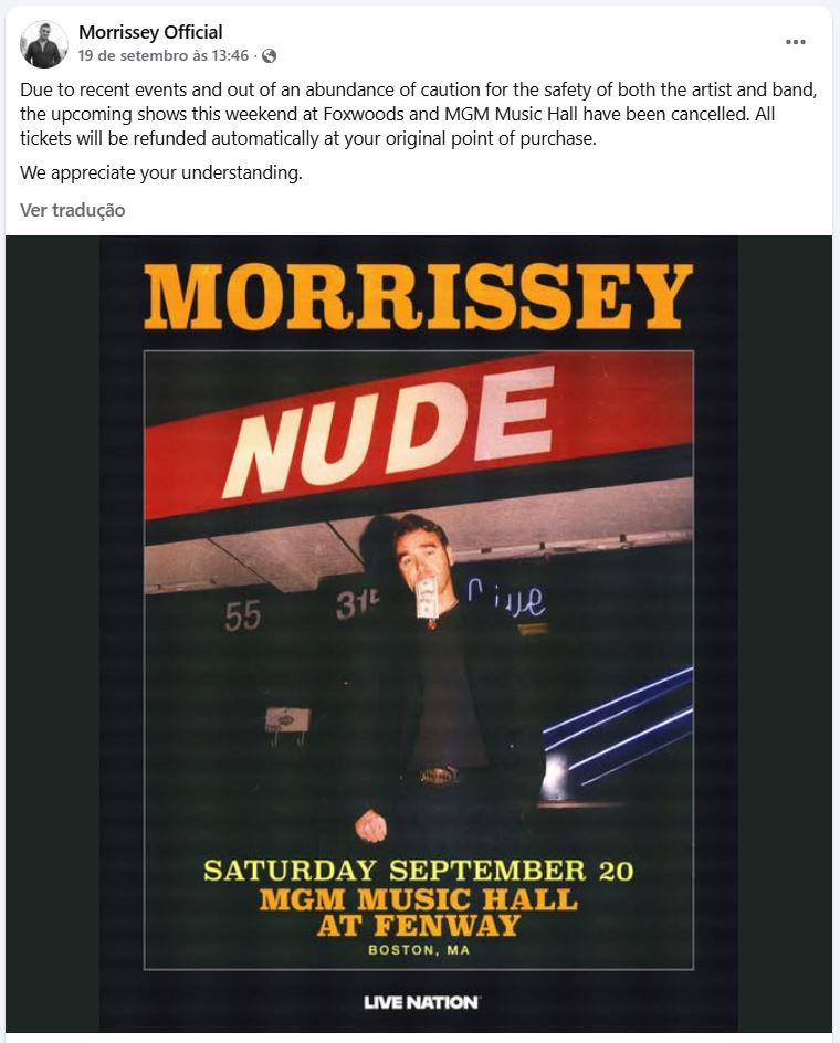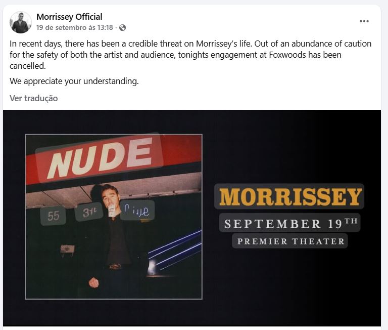 Na mensagem na página oficial do cantor no Facebook, a mensagem diz: “Nos últimos dias, houve uma ameaça crível à vida de Morrissey. Por excesso de cautela para a segurança tanto do artista quanto do público, o show desta noite no Foxwoods foi cancelado. Agradecemos a compreensão“.