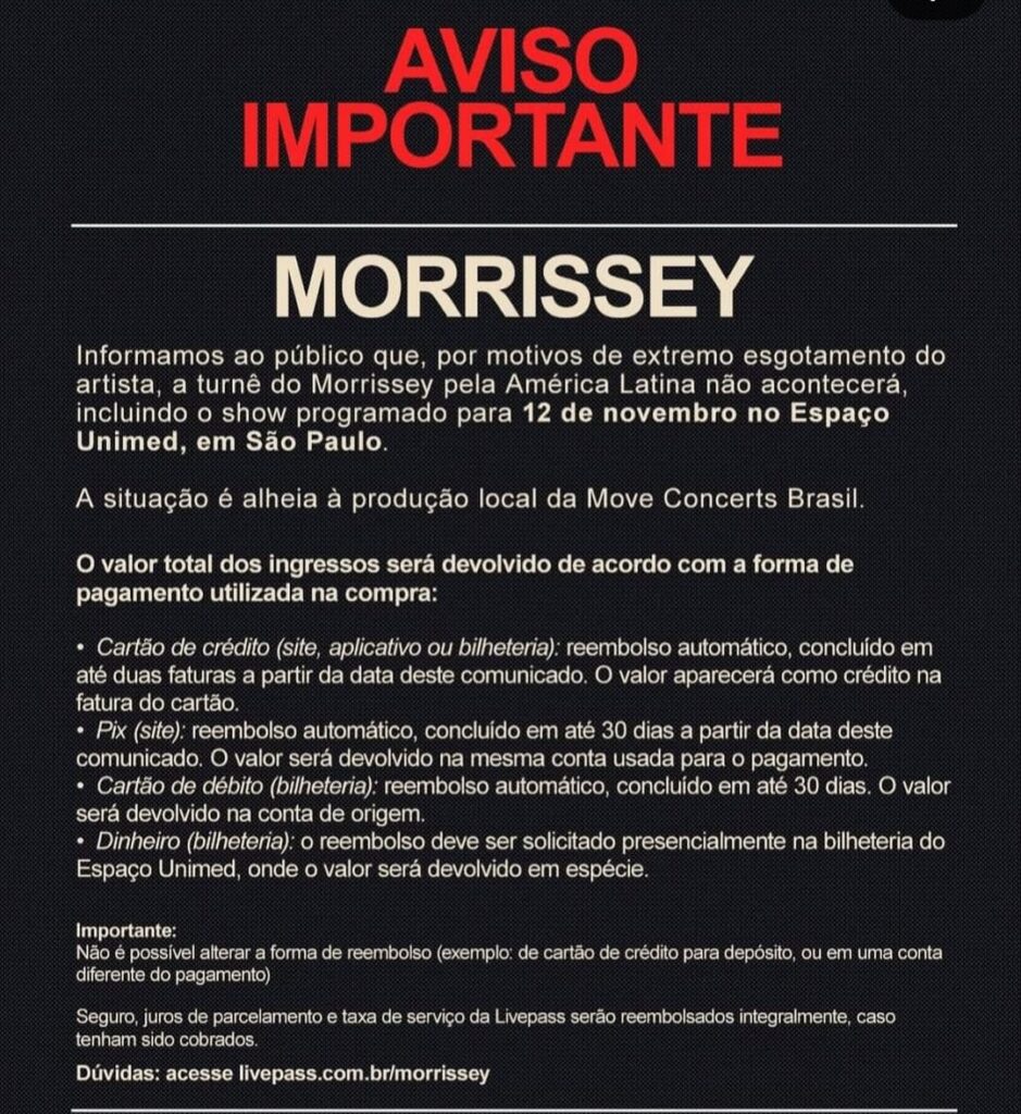 Trata-se de o terceiro ano consecutivo que Morrissey cancela a sua vinda ao Brasil. No começo de 2024, ele também cancelou os shows com a mesma alegação de “exaustão física”.