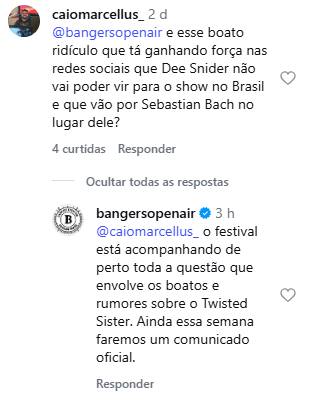 Com isso, o Bangers Open Air soltou como resposta que eles “estão acompanhando de perto o caso do Twisted Sisters e darão uma declaração nesta quinta”.